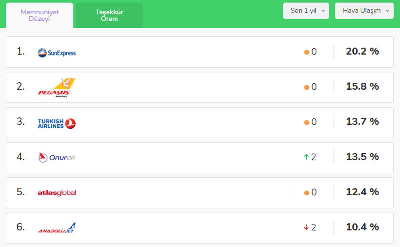 Bu açıdan baktığımızda SunExpress Havayolları ve Onur Air, memnuniyet oranları Şikayet Var ortalamasının nispeten altında kalsa da genel olarak daha başarılı bir profil çiziyorlar. Sonuçta müşterilerin teşekkür ettiği şikayet çözümlerinin varlığı bile potansiyel müşterileri etkileyebilecek güçte.